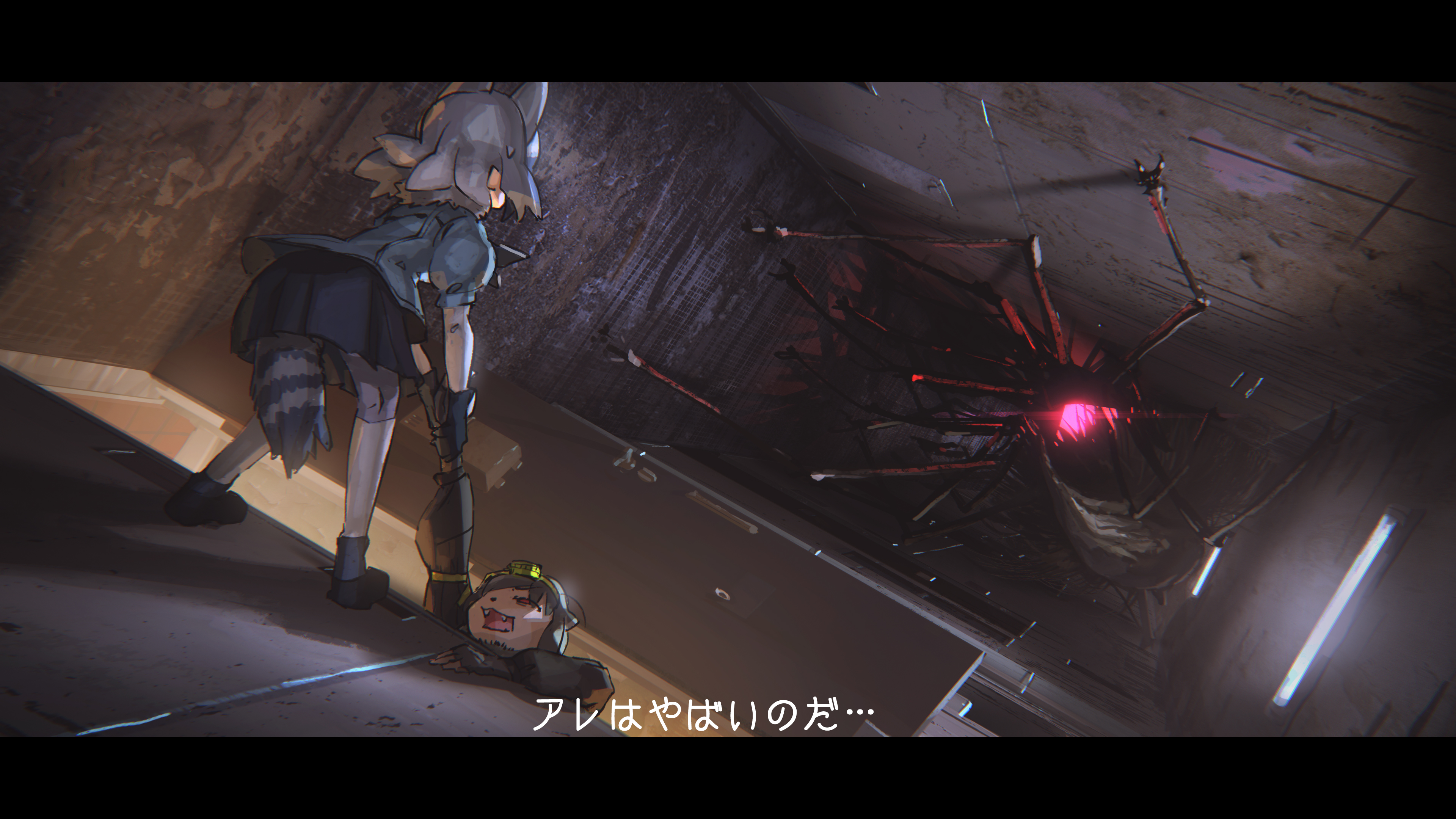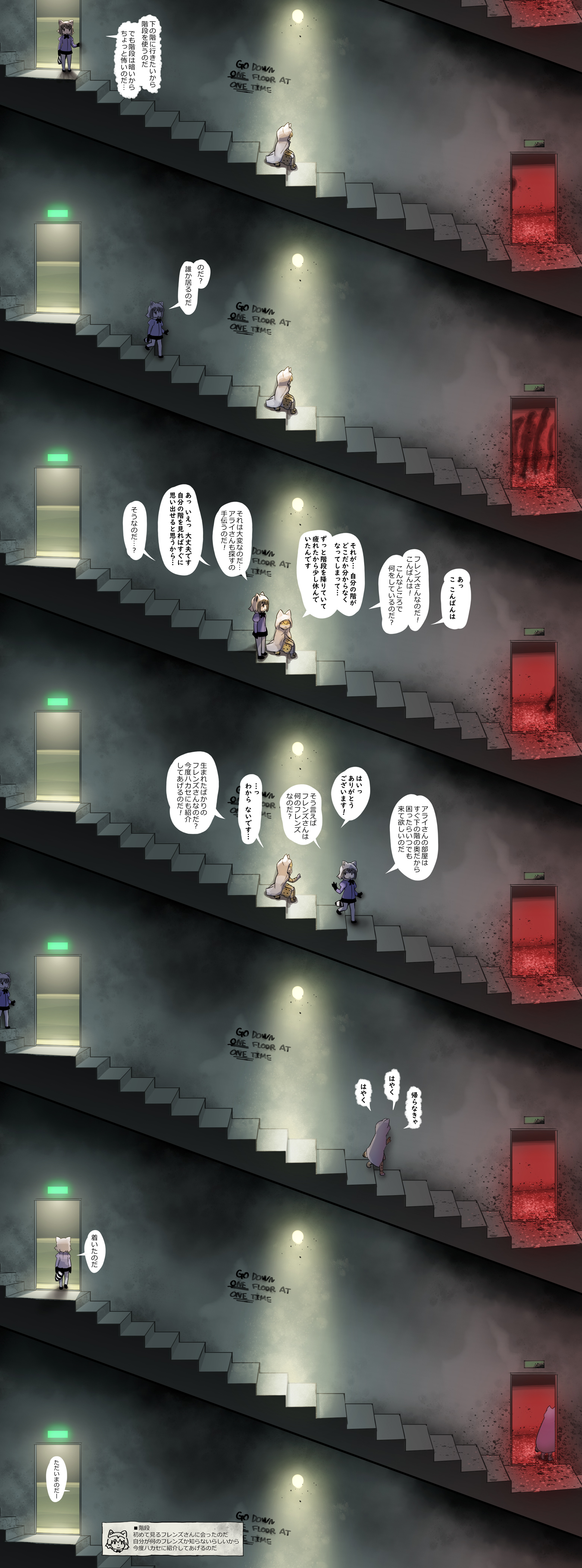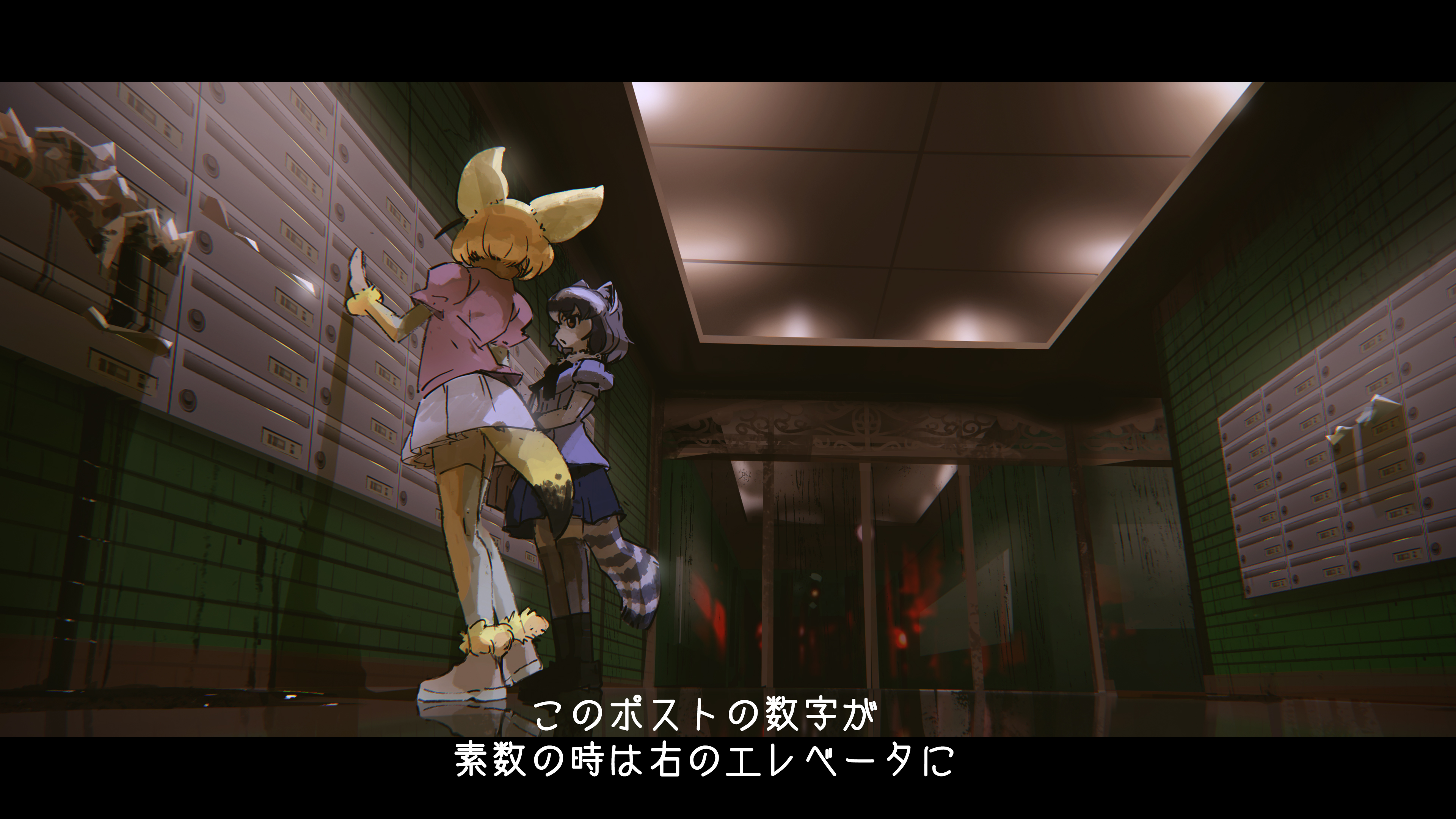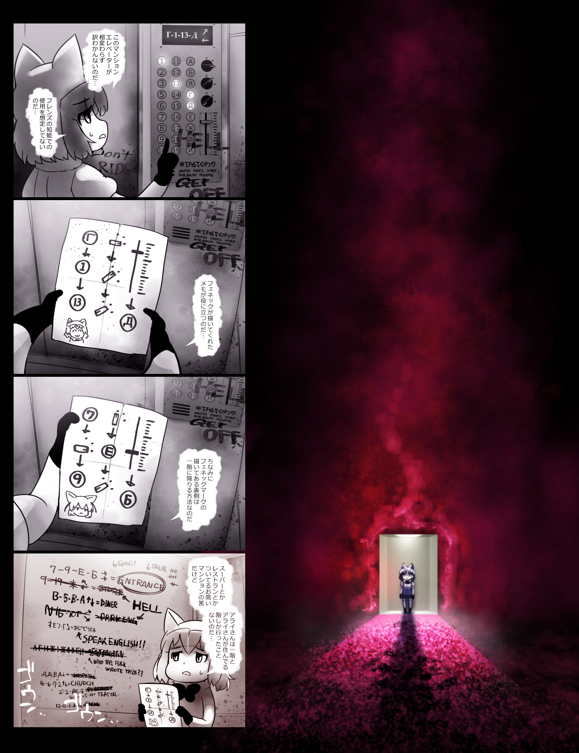 A series by Abubu [ Tweet link (maybe NSFW) ] featuring characters from Kemono Friends that takes place inside of an anomalous apartment complex. The story initially follows Arai-san, who is trying to get back home, but also features the adventures of a team of Giant Otters as they explore the dangers and other oddities of the building as well as a number of original characters.