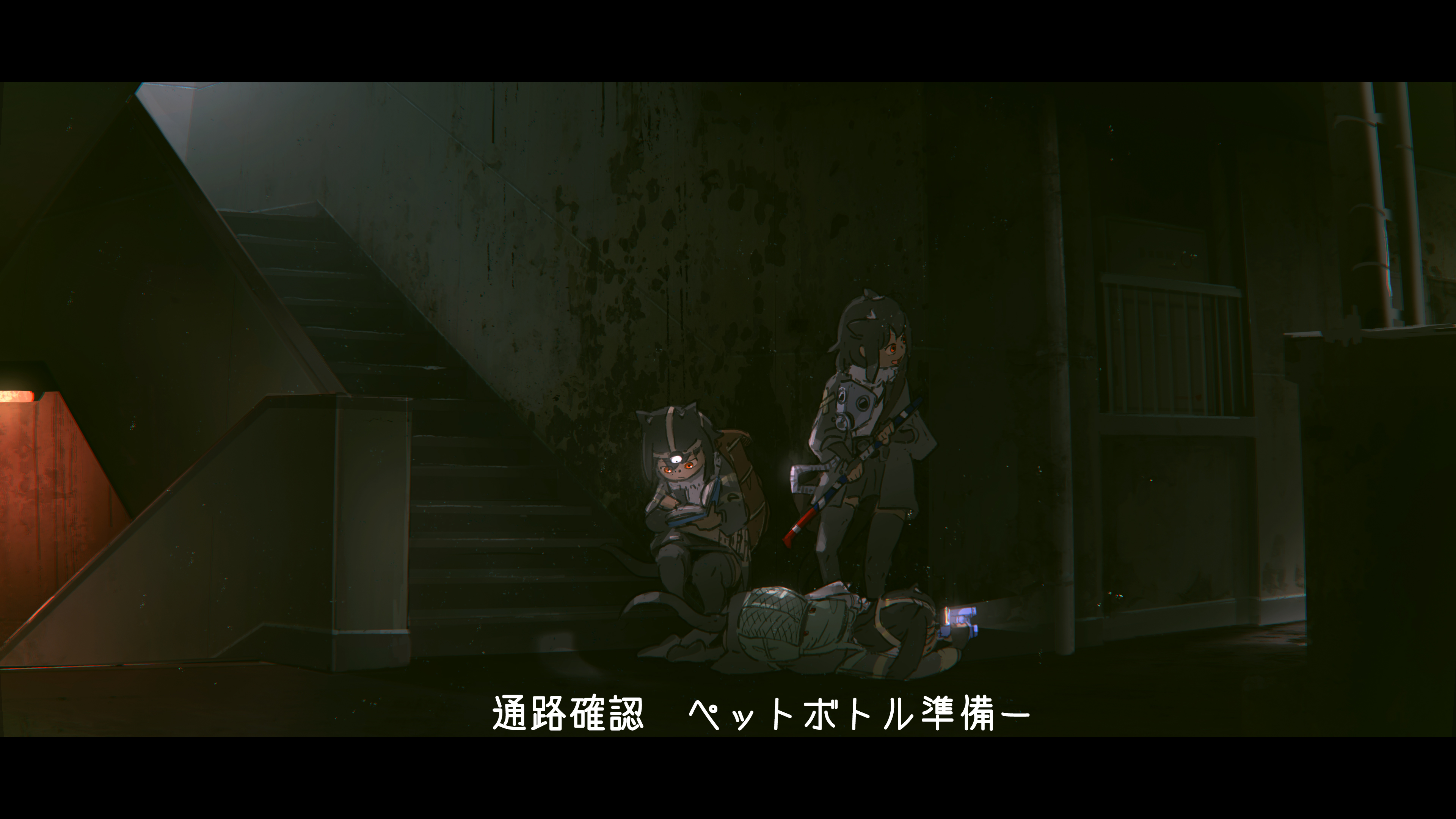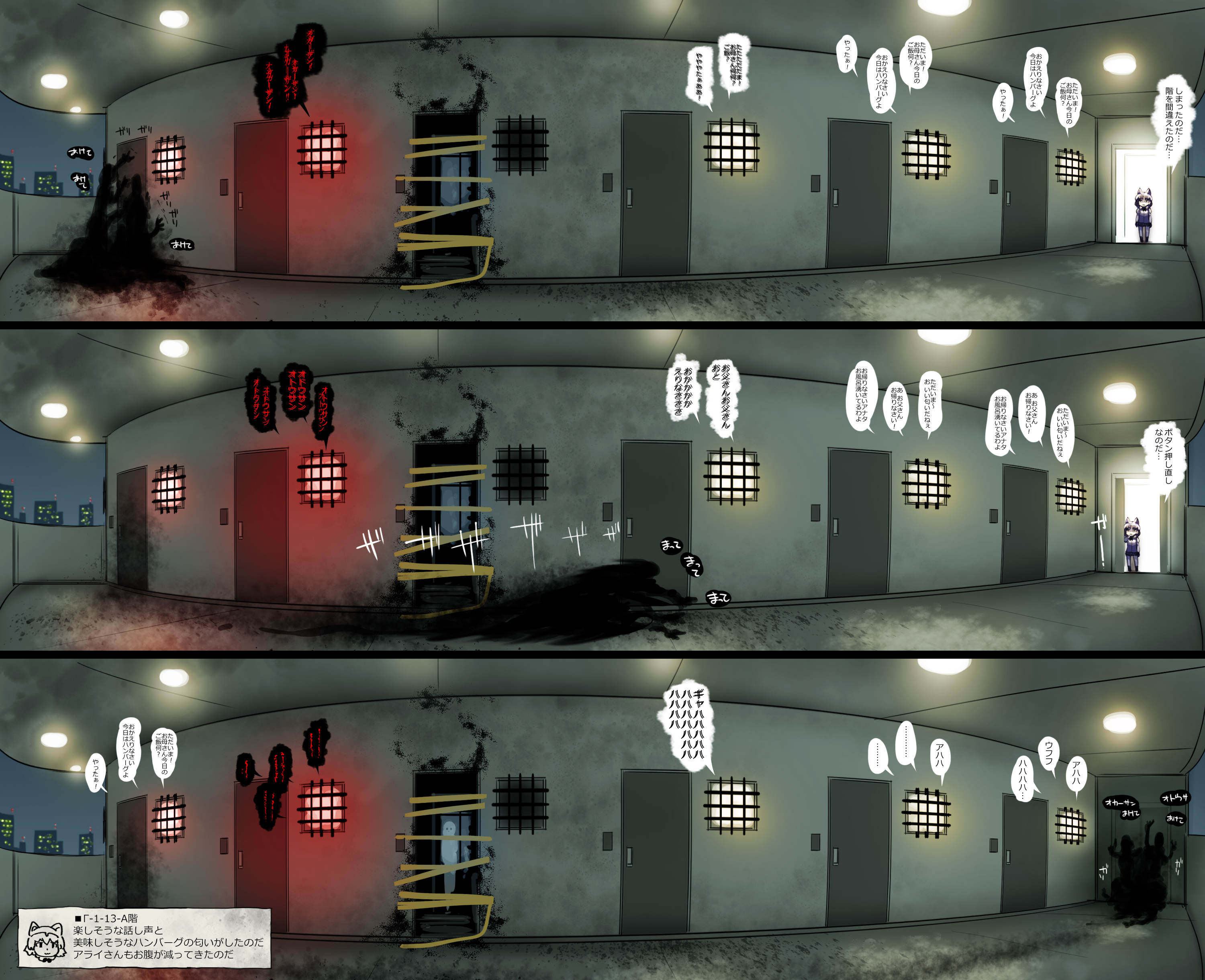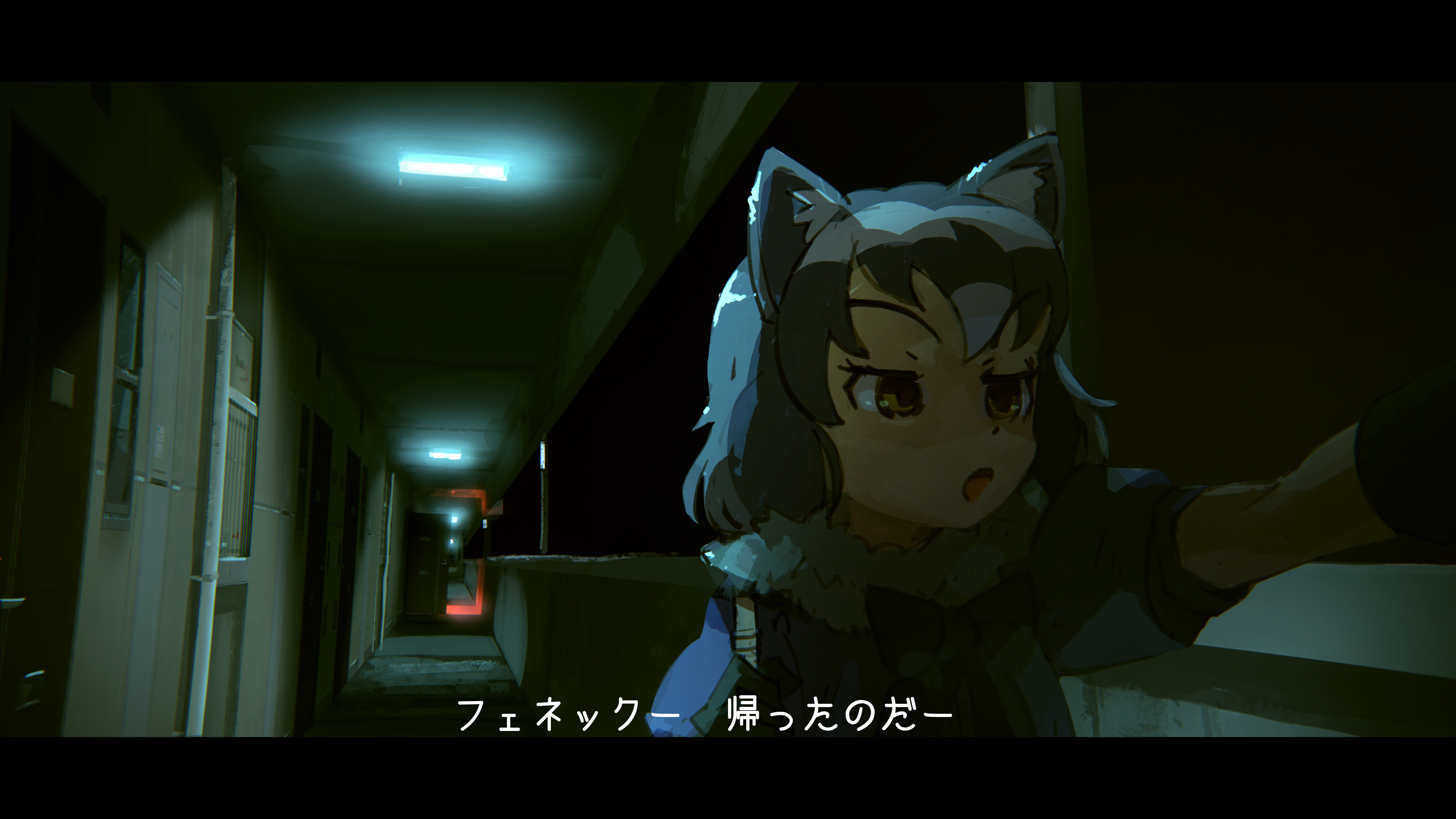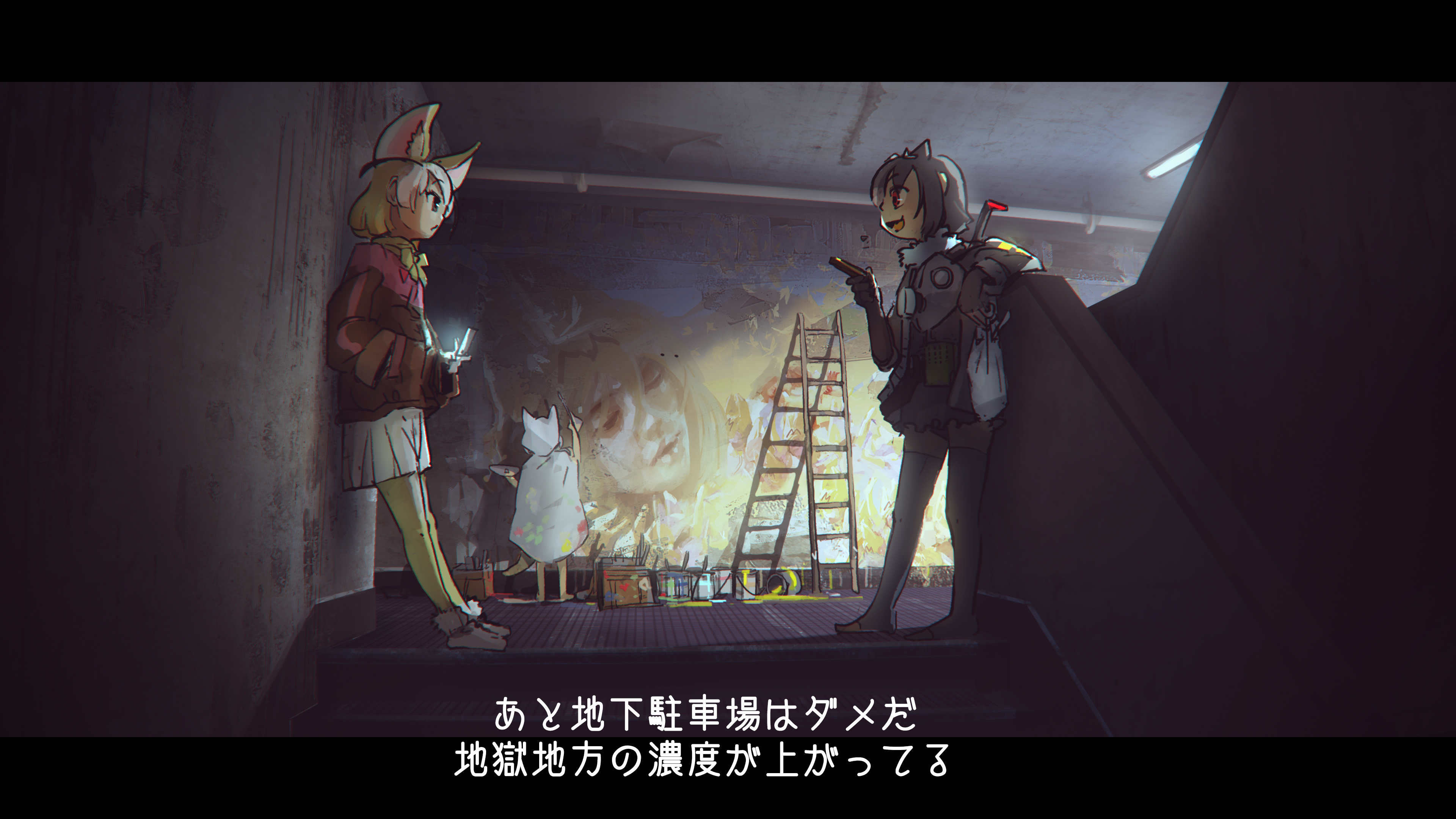 A series by Abubu [ Tweet link (maybe NSFW) ] featuring characters from Kemono Friends that takes place inside of an anomalous apartment complex. The story initially follows Arai-san, who is trying to get back home, but also features the adventures of a team of Giant Otters as they explore the dangers and other oddities of the building as well as a number of original characters.