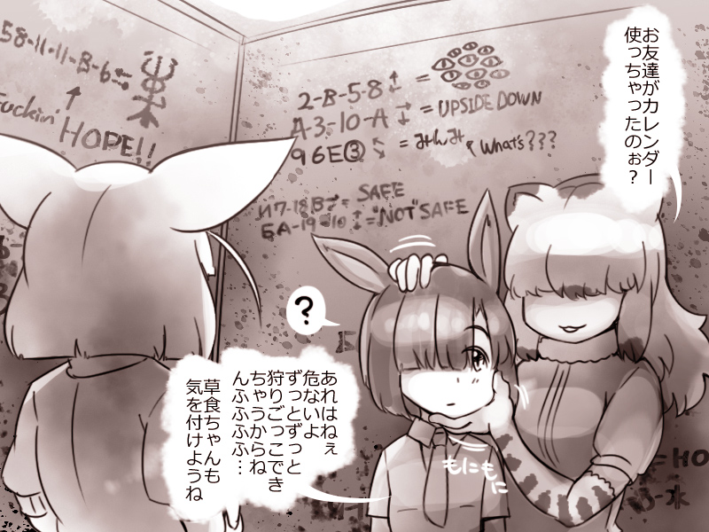 Carnivore: Your friend used the calendar, you say~?Carnivore: That’s dangerous, you know~ you can play hunt over and over again. Ufufufu…(laugh). You should be careful too, Herbivore-chan.text in wall: