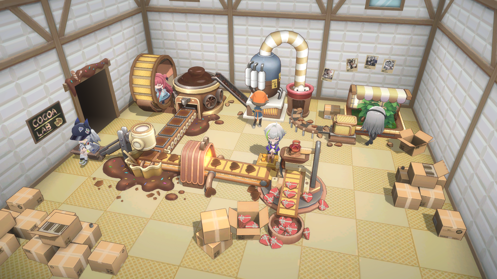 At the Chocolaterie, you can make chocolates and Imaging Cocoa Powder. An Assist Doll may be selected to help with the production, and you may use “Acceleration Cards” to speed up the process. Each completed production grants a certain amount of Production EXP, which is used to raise your Production Level and unlock more facilities and recipes. You can use chocolates to gain Algorithm Set A-la-Carte Box - α, Reconfiguration Generators, Imaging Cocoa Powders and many other rewards.