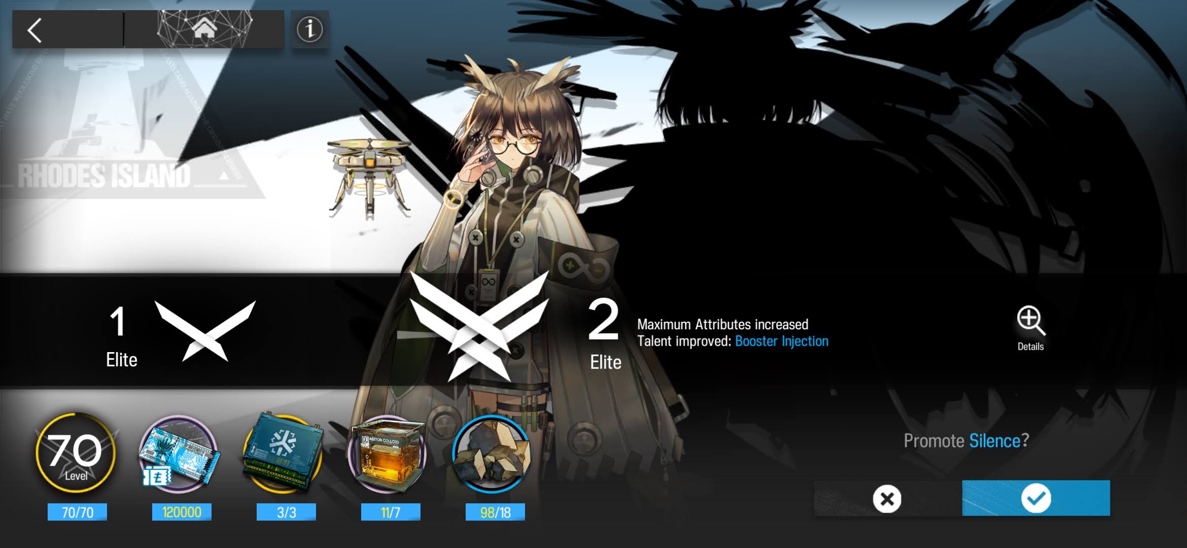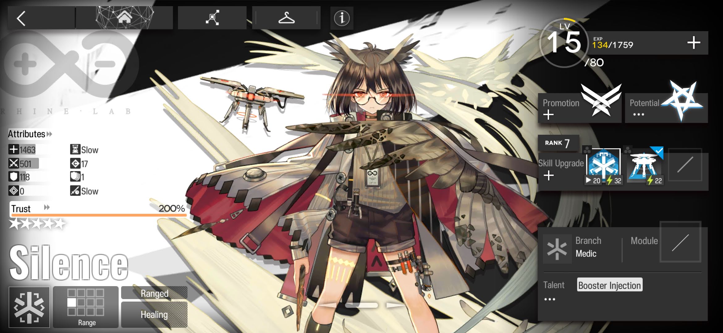 Silence is known for her S2 healing drone. E2 promotion is neccesary for skill mastery (lower cooldown) and drone healing boost.