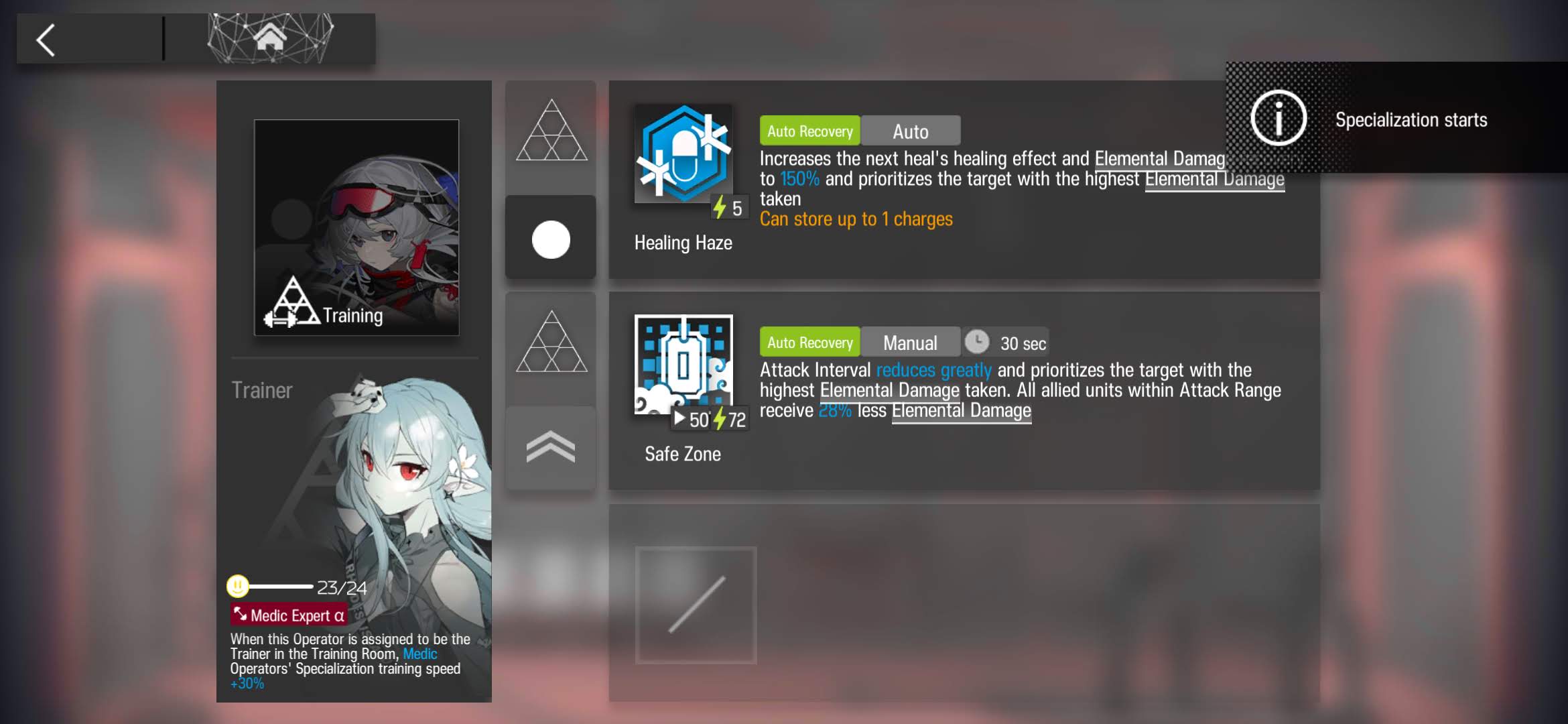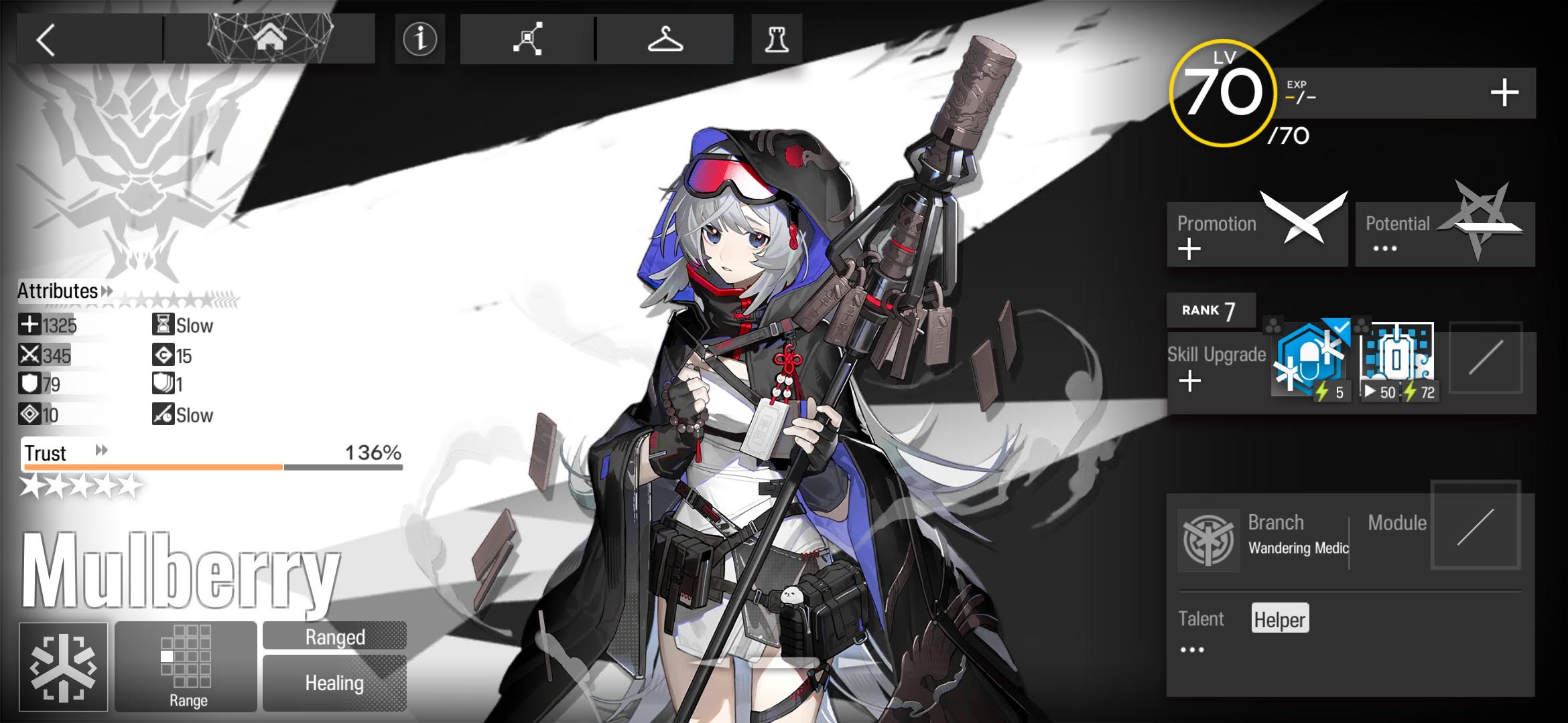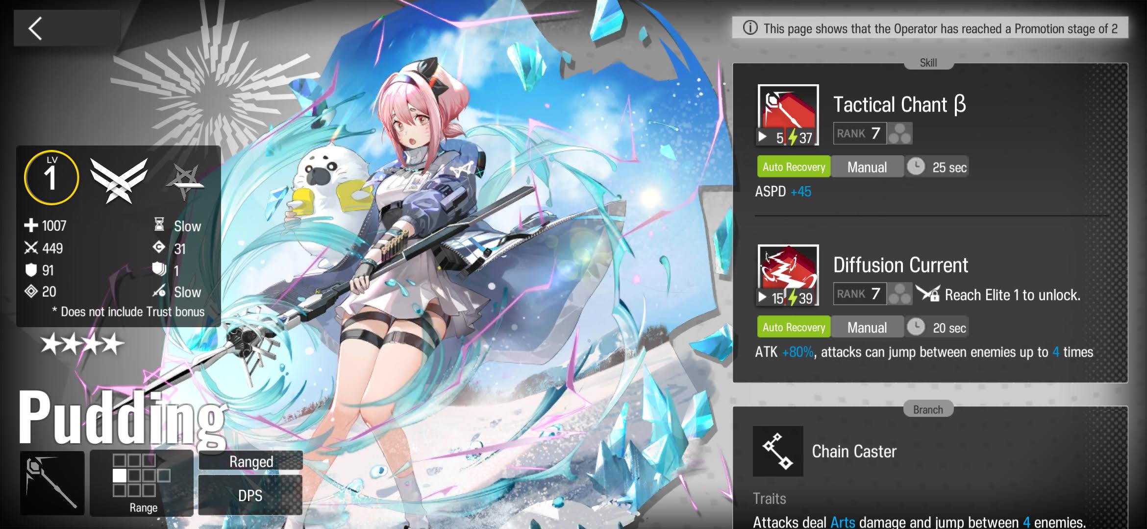 Pudding is a very solid 4* option, bringing competitive damage and cycle time to a weak class and archtype. She doesn’t quite surpass Click as the premiere 4* Caster, but she is a competitive option. Both of her skills are good options for mastery, but favor her S2. Her S1 is the better control skill but the damage is significantly worse and she doesn’t reach 100% uptime on the slow, so there’s usually better options for that. Her S2 meanwhile is what makes her special as a chain caster. As long as there’s at least 2 enemies, she reaches her full damage potential, something the higher rarity Leizi struggles with.