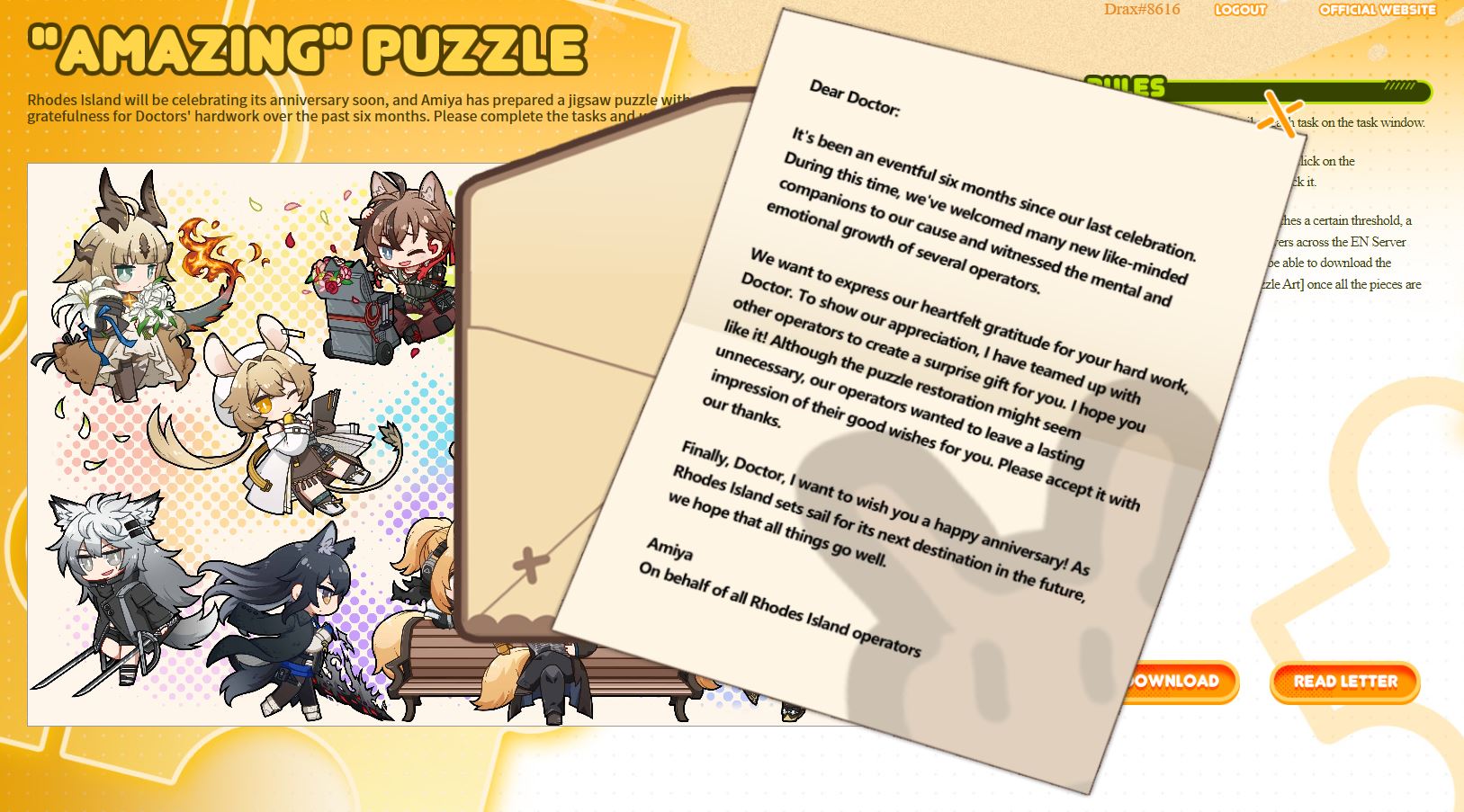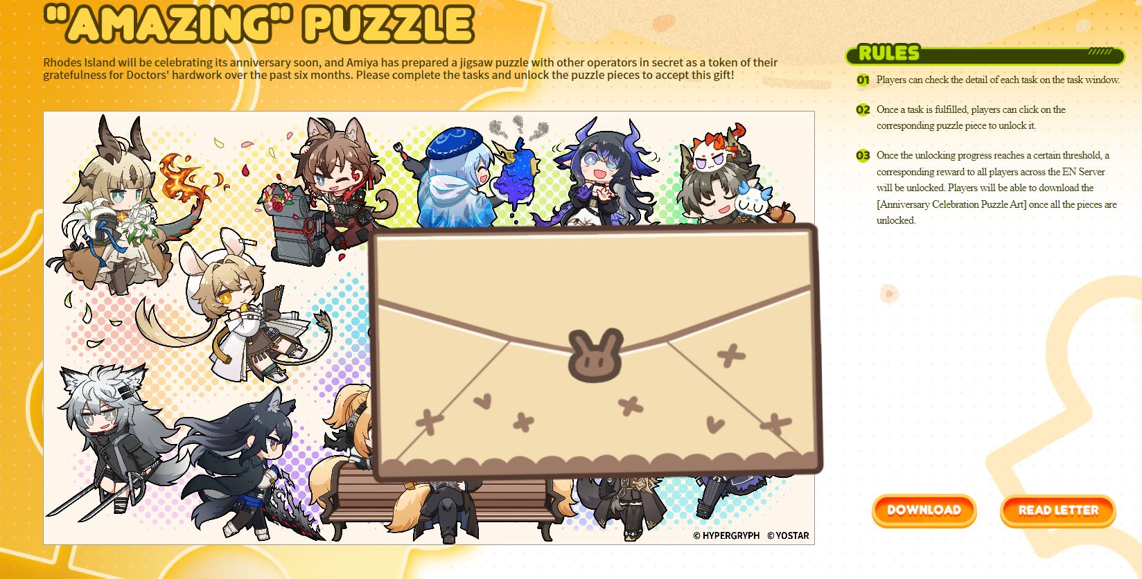 Rhodes Island will be celebrating its anniversary soon, and Amiya has prepared a jigsaw puzzle with other operators in secret as a token of their gratefulness for Doctors’ hardwork over the past six months. Please complete the tasks and unlock the puzzle pieces to accept this gift!