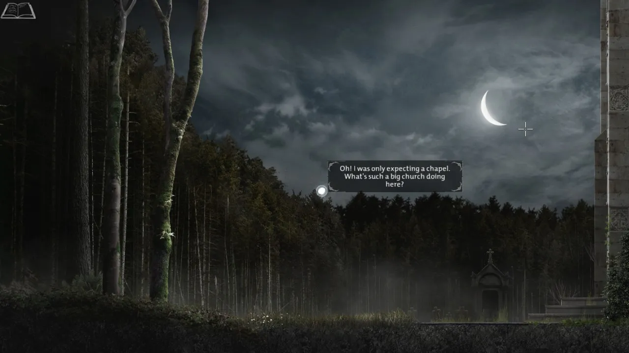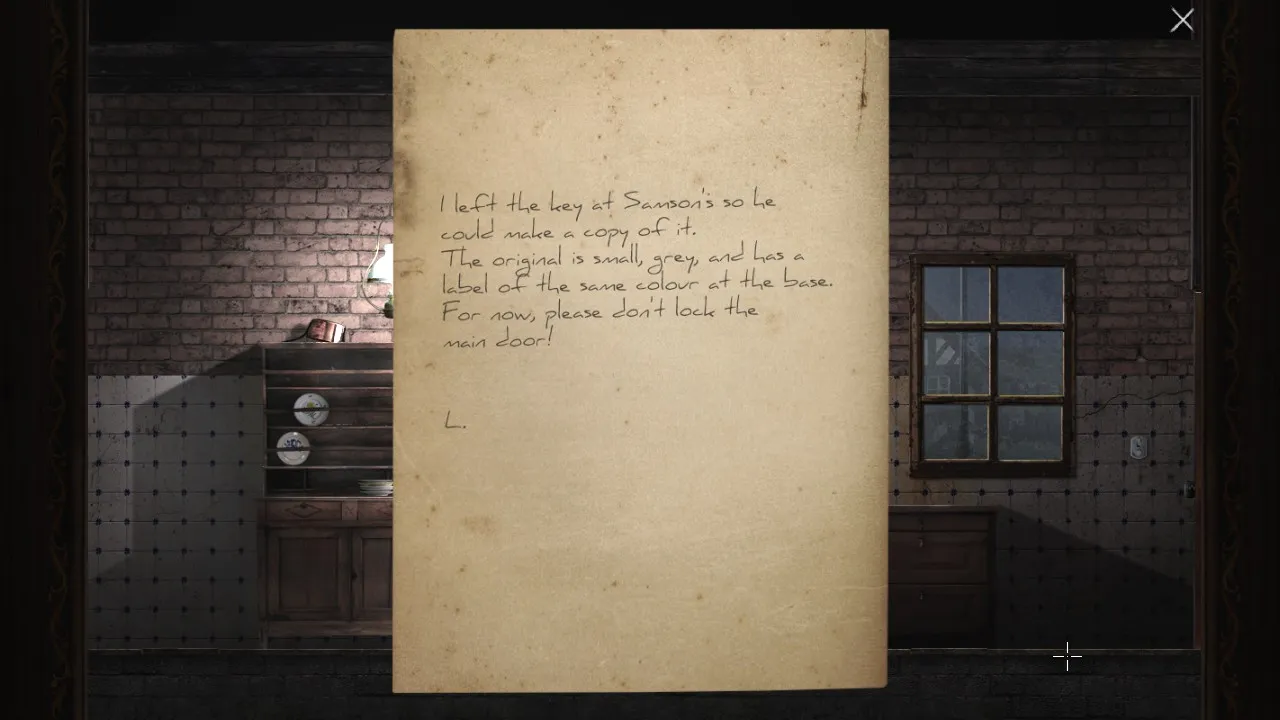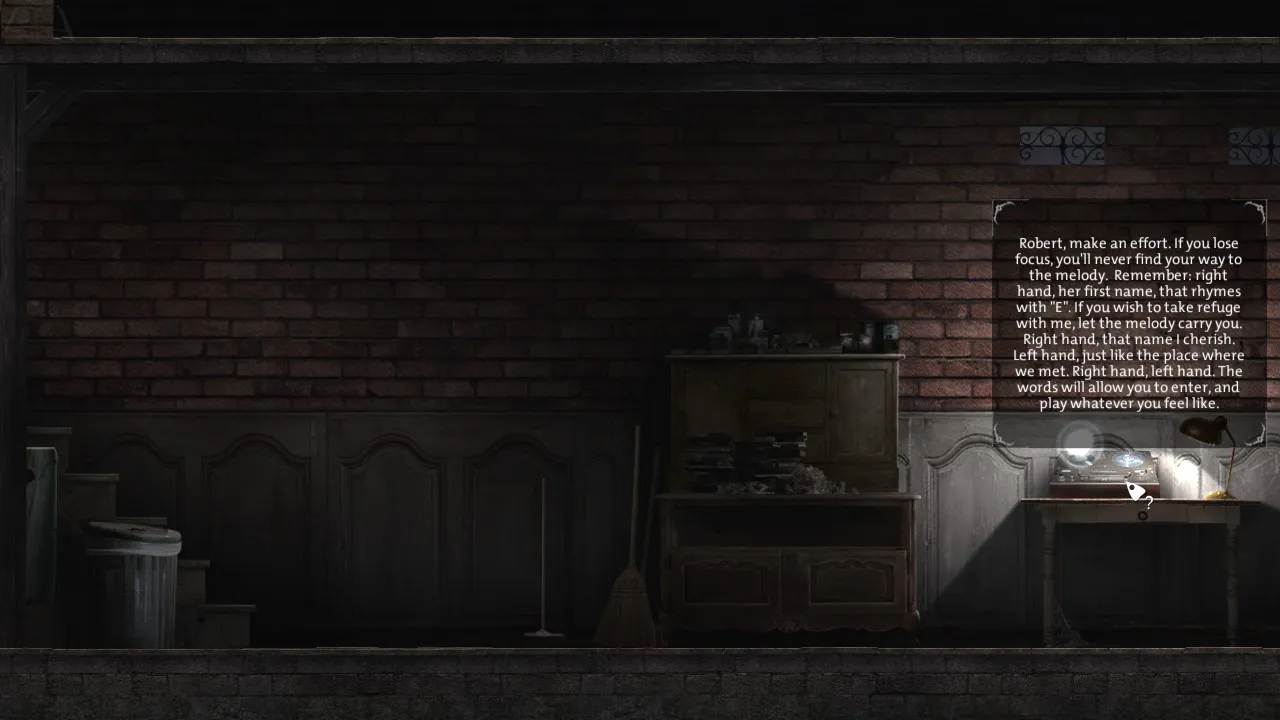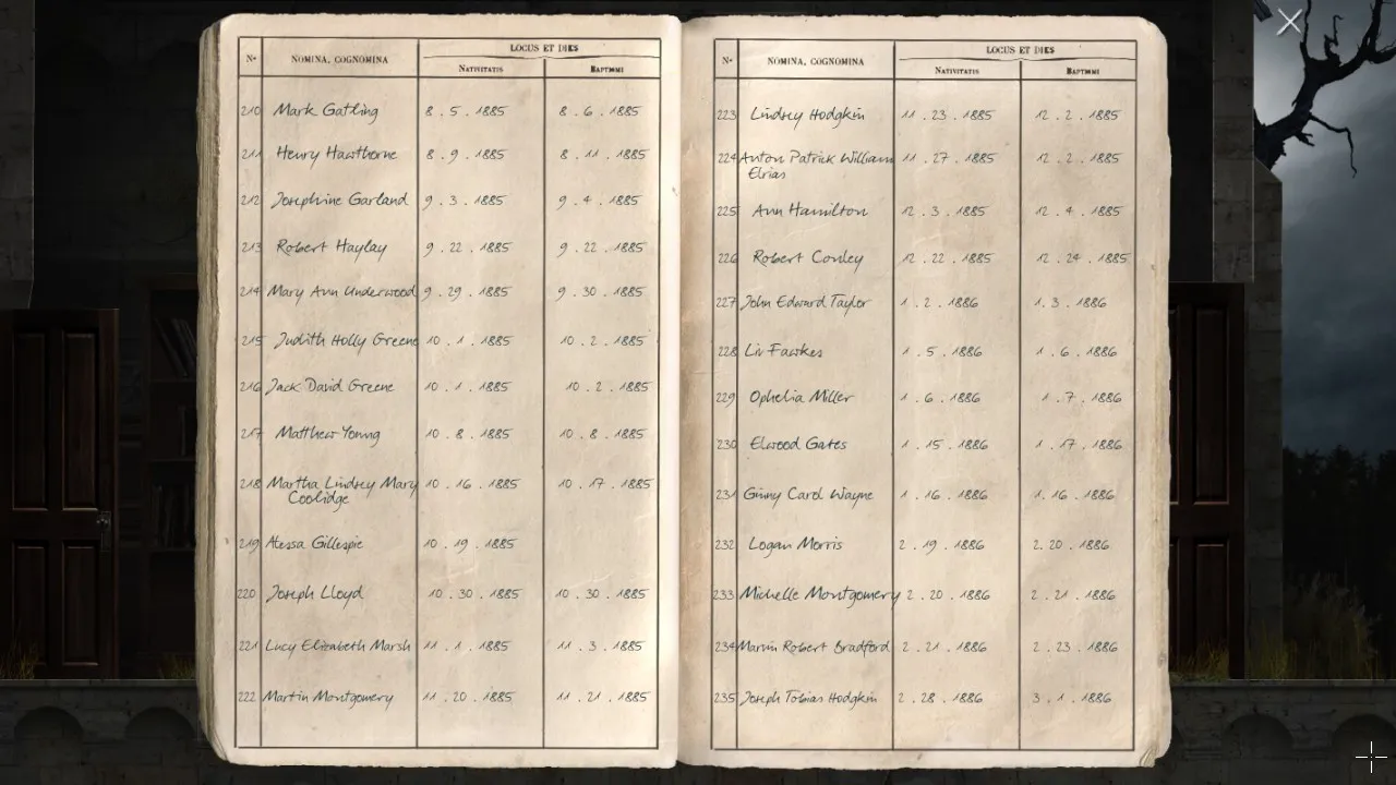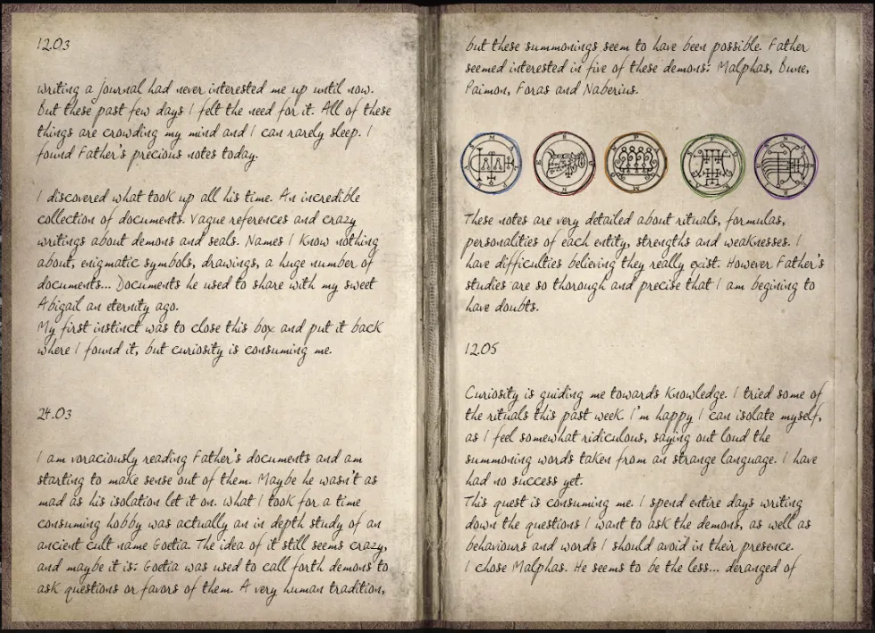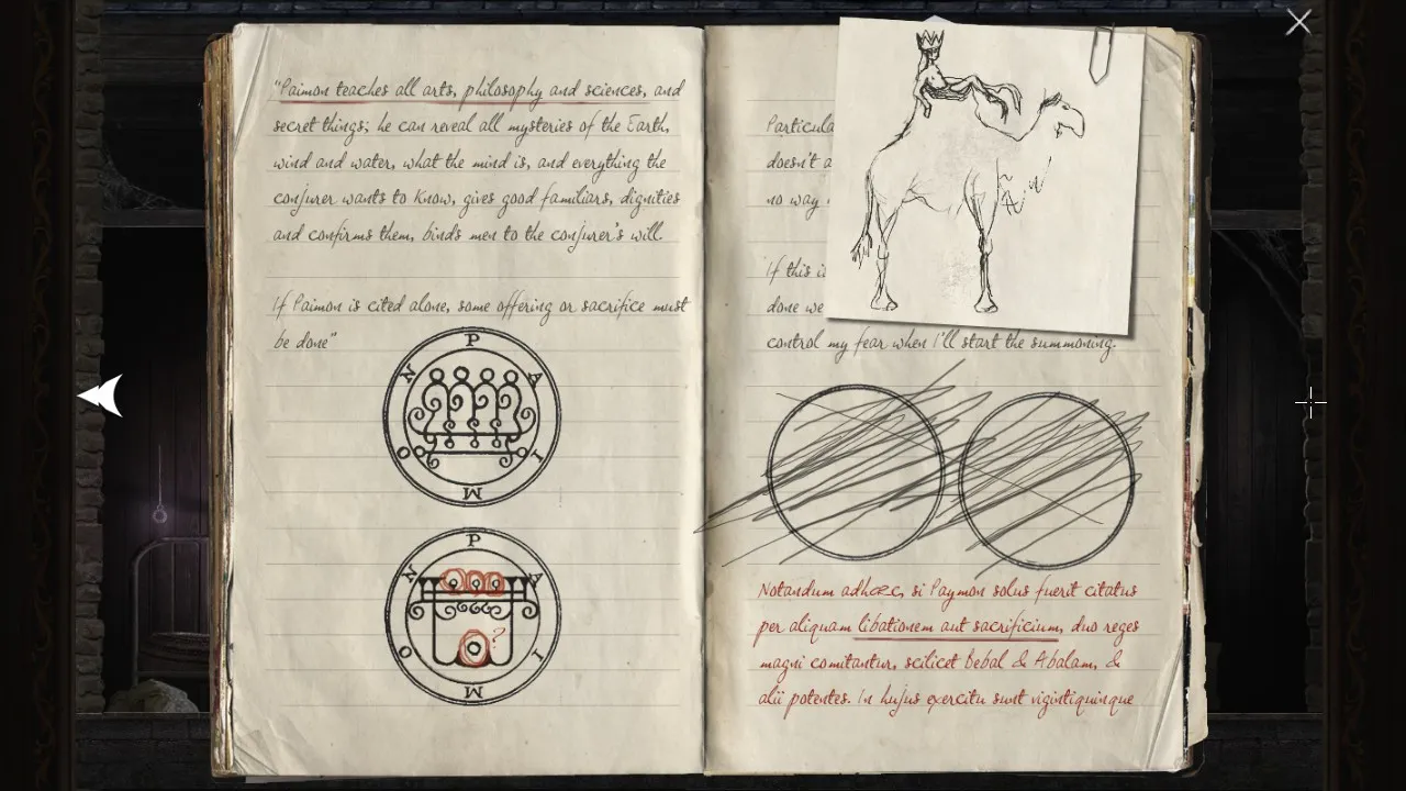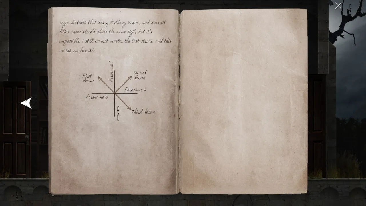 - Return to office with puzzle box. Pick up journal. Carry journal outside, towards the forest. Secret brick now revealed.