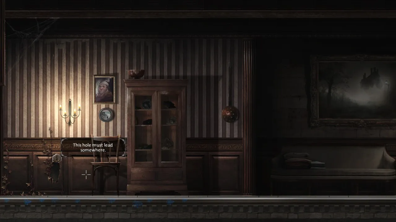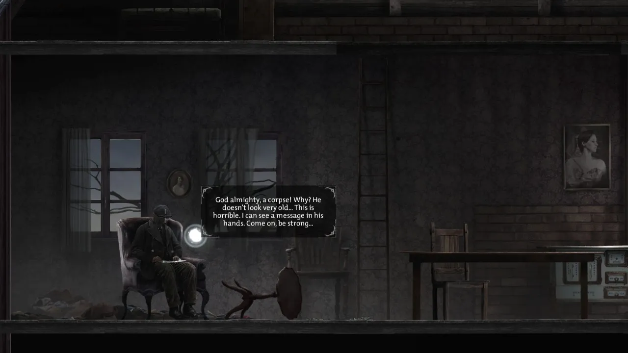 Steam Achievement: “First encounter, Make contact with a demon.” - Head down, down beneath the floor to the kitchen. Note blank(?) page. Note combination lock on left.